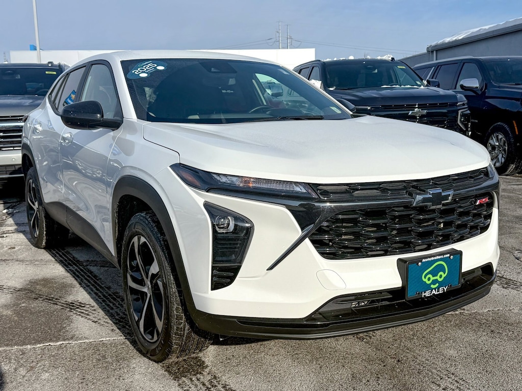 Certified. Summit White 2025 Chevrolet Trax 1RS FWD 6-Speed Automatic 1.2L Ecotec Turbo DOHC DI w/VVT 2-Way Adjustable Front Head Restraints, 3.50 Final Drive Axle Ratio, 4 Speakers, 4-Speaker Audio System Feature, 4-Way Manual Front Passenger Seat Adjuster, 4-Wheel Disc Brakes, 6-Way Manual Driver Seat Adjuster, ABS brakes, Air Conditioning, Alloy wheels, AM/FM radio: SiriusXM, Auto High-beam Headlights, Brake assist, Bumpers: body-color, Cloth Seat Trim, Compass, Delay-off headlights, Driver Confidence Package, Driver door bin, Driver vanity mirror, Dual front impact airbags, Dual front side impact airbags, Electronic Stability Control, Emergency communication system: OnStar One Essentials, Exterior Parking Camera Rear, Front anti-roll bar, Front Bucket Seats, Front Center Armrest, Front reading lights, Front wheel independent suspension, Fully automatic headlights, Heated door mirrors, Heated Driver and Front Passenger Seats, Heated front seats, Heated steering wheel, Illuminated entry, Lane Change Alert with Side Blind Zone Alert, Leather steering wheel, Low tire pressure warning, Occupant sensing airbag, Outside temperature display, Overhead airbag, Overhead console, Panic alarm, Passenger door bin, Passenger vanity mirror, Power door mirrors, Power steering, Power windows, Preferred Equipment Group 1RS, Premium audio system: Chevrolet Infotainment 3, Radio data system, Radio: Chevrolet Infotainment 3 System with AM/FM, Rear Cross-Traffic Alert, Rear Park Assist, Rear window defroster, Rear window wiper, Remote keyless entry, Security system, SiriusXM Trial Subscription, Speed control, Split folding rear seat, Spoiler, Sport steering wheel, Steering wheel mounted audio controls, Tachometer, Telescoping steering wheel, Tilt steering wheel, Traction control, Trip computer, Variably intermittent wipers, Wheels: 18 Black-Painted Machined Aluminum.