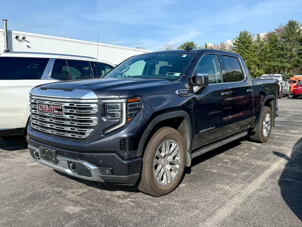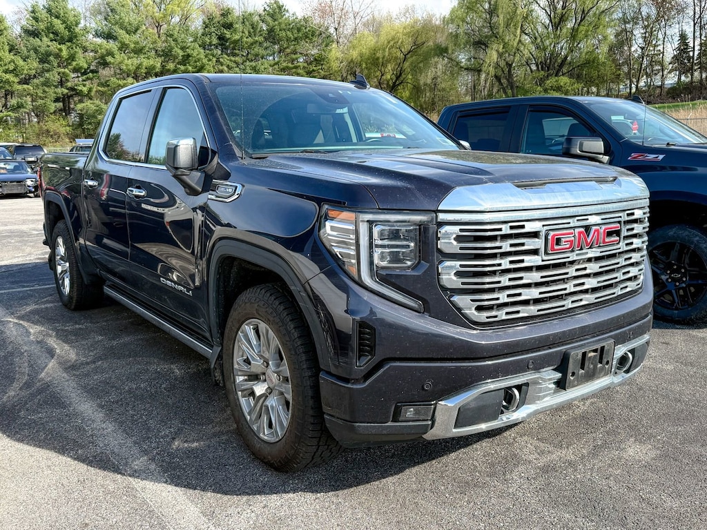 Certified. Titanium Rush Metallic 2022 GMC Sierra 1500 Denali 4WD 10-Speed Automatic EcoTec3 5.3L V8 10-Way Power Driver Seat Adjuster w/Lumbar, 10-Way Power Passenger Seat Adjuster w/Lumbar, 120-Volt Bed Mounted Power Outlet, 120-Volt Instrument Panel Power Outlet, 170 Amp Alternator, 2 Charge/Data USB Ports Inside Center Console, 2 Type-C Charge-Only Rear USB Ports, 2 USB Ports, 3 Years of OnStar Safety & Security, 3.23 Rear Axle Ratio, 4-Wheel Disc Brakes, 7 Speakers, ABS brakes, Adaptive suspension, Air Conditioning, Alloy wheels, AM/FM radio: SiriusXM with 360L, Apple CarPlay/Android Auto, Auto High-beam Headlights, Auto-dimming door mirrors, Auto-dimming Rear-View mirror, Auto-Locking Rear Differential, Automatic Emergency Braking, Automatic temperature control, Auxiliary External Transmission Oil Cooler, Bed View Camera, Brake assist, Buckle to Drive, Bumpers: body-color, Chrome Header w/Signature Denali Chrome Grille, Chrome Recovery Hooks, Chrome Wheel To Wheel Assist Steps, Color-Keyed Carpeting Floor Covering, Compass, Deep-Tinted Glass, Delay-off headlights, Denali Premium Suspension w/Adaptive Ride Control, Driver door bin, Driver Memory, Driver vanity mirror, Dual front impact airbags, Dual front side impact airbags, Electric Rear-Window Defogger, Electrical Steering Column Lock, Electronic Stability Control, Emergency communication system: OnStar and GMC Connected Services capable, Floor-Mounted Center Console, Following Distance Indicator, Forge Perforated Leather Seat Trim, Forward Collision Alert, Front & Rear Black Molded Splash Guards (LPO), Front anti-roll bar, Front Bucket Seats, Front Center Armrest, Front dual zone A/C, Front fog lights, Front License Plate Kit, Front Pedestrian Braking, Front Prem Floor Liners w/Removable Carpet Insert, Front Rainsensing Wipers, Front reading lights, Front wheel independent suspension, Fully automatic headlights, Garage door transmitter, Genuine wood console insert, Genuine wood dashboard insert, Genuine wood door panel insert, GMC Connected Access Capable, GMC MultiPro Power Steps, HD Surround Vision, Heated 2nd Row Outboard Seats, Heated door mirrors, Heated Driver & Front Outboard Passenger Seating, Heated front seats, Heated rear seats, Heated Steering Wheel, Heated steering wheel, Heavy-Duty Air Filter, Hill Descent Control, Hitch Guidance, Hitch Guidance w/Hitch View, Illuminated entry, In-Vehicle Trailering App, Integrated Trailer Brake Controller, IntelliBeam Automatic High Beam On/Off, Keyless Open & Start, Lane Keep Assist w/Lane Departure Warning, LED Cargo Area Lighting, Low tire pressure warning, Memory seat, Navigation System, Not Equipped w/Dynamic Fuel Management, Not Equipped w/Front & Rear Park Assist, Not Equipped w/Steering Column Lock, Occupant sensing airbag, OnStar & GMC Connected Services Capable, Outside temperature display, Overhead airbag, Overhead console, Panic alarm, Passenger door bin, Passenger vanity mirror, Perimeter Lighting, Power Door Locks, Power door mirrors, Power driver seat, Power Front Passenger Windows w/Express Up/Down, Power Front Windows w/Driver Express Up/Down, Power passenger seat, Power Rake & Telescoping Steering Column, Power Rear Windows w/Express Down, Power Sliding Rear Window w/Rear Defogger, Power steering, Power Sunroof, Power windows, Preferred Equipment Group 5SA, Premium audio system: GMC Infotainment System, Premium Bose 7-Speaker Sound System, Push Button Start, Radio data system, Radio: Premium GMC Infotainment Audio System, Rain sensing wipers, Rear Cross Traffic Braking, Rear Pedestrian Detection, Rear Prem Floor Liners w/Removable Carpet Insert, Rear reading lights, Rear seat center armrest, Rear step bumper, Rear Wheelhouse Liners, Rear window defroster, Remote keyless entry, Remote Vehicle Starter System, Safety Alert Seat, Security system, SiriusXM w/360L, Speed control, Speed-sensing steering, Split folding rear seat, Spray-On Pickup Bed Liner w/Den