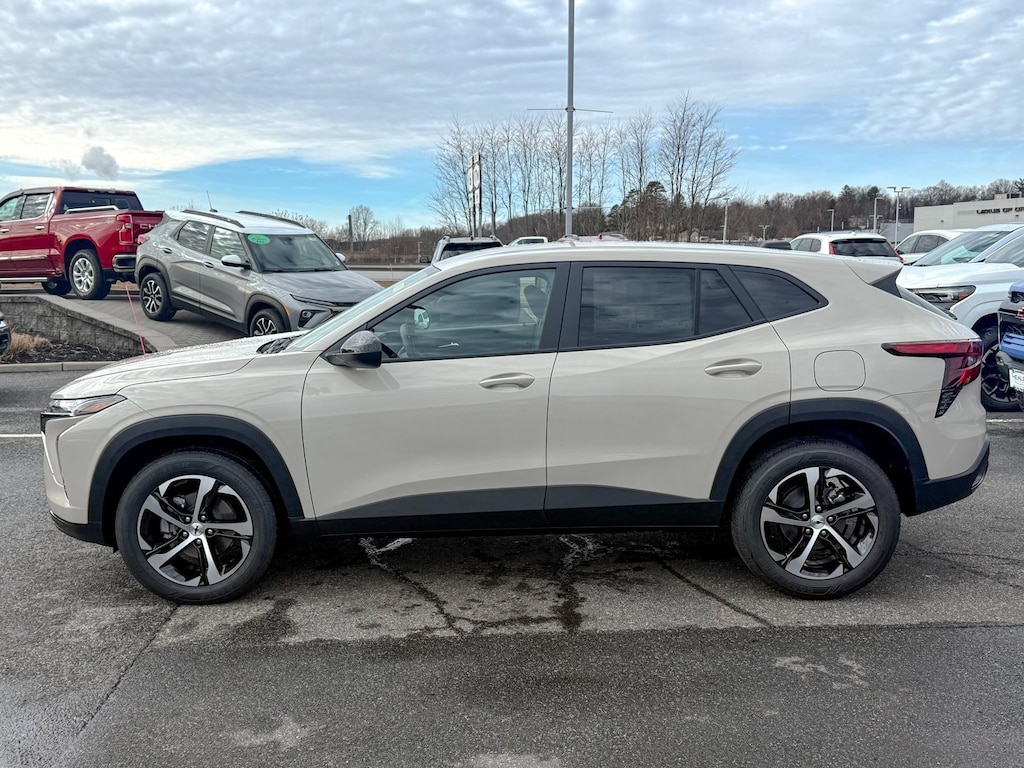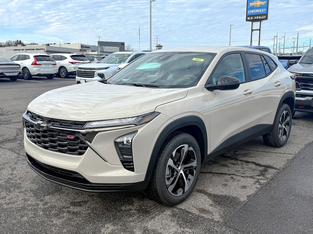 White Sands 2026 Chevrolet Trax 1RS FWD 6-Speed Automatic ECOTEC 1.2L Turbo 2-Way Adjustable Front Head Restraints, 3.50 Final Drive Axle Ratio, 4 Speakers, 4-Speaker Audio System Feature, 4-Way Manual Front Passenger Seat Adjuster, 4-Wheel Disc Brakes, 6-Way Manual Driver Seat Adjuster, ABS brakes, Air Conditioning, Alloy wheels, AM/FM radio: SiriusXM, Auto High-beam Headlights, Brake assist, Bumpers: body-color, Cloth Seat Trim, Compass, Delay-off headlights, Deleted Mobile Service Plus, Driver Confidence Package, Driver door bin, Driver vanity mirror, Dual front impact airbags, Dual front side impact airbags, Electronic Stability Control, Emergency communication system: OnStar One Essentials, Exterior Parking Camera Rear, Front and Rear Jet Black All-Weather Floor Mats, Front anti-roll bar, Front Bucket Seats, Front Center Armrest, Front reading lights, Front wheel independent suspension, Fully automatic headlights, Heated door mirrors, Heated Driver and Front Passenger Seats, Heated front seats, Heated steering wheel, Illuminated entry, Lane Change Alert with Side Blind Zone Alert, Leather steering wheel, License Plate Front Mounting Package, Low tire pressure warning, Occupant sensing airbag, Outside temperature display, Overhead airbag, Overhead console, Panic alarm, Passenger door bin, Passenger vanity mirror, Power door mirrors, Power steering, Power windows, Preferred Equipment Group 1RS, Premium audio system: Chevrolet Infotainment 3, Radio data system, Radio: Chevrolet Infotainment 3 System with AM/FM, Rear Cross Traffic Alert, Rear Park Assist, Rear window defroster, Rear window wiper, Remote keyless entry, Security system, SiriusXM Trial Subscription, Speed control, Split folding rear seat, Spoiler, Sport steering wheel, Steering wheel mounted audio controls, Tachometer, Telescoping steering wheel, Tilt steering wheel, Traction control, Trip computer, Variably intermittent wipers, Wheels: 18 Black-Painted Machined Aluminum, Wireless Apple CarPlay/Wireless Android Auto.