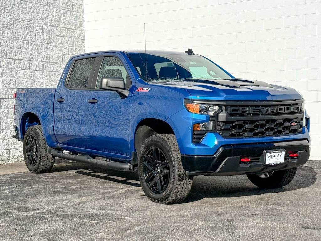 Glacier Blue Metallic 2023 Chevrolet Silverado 1500 Custom Trail Boss 4WD 10-Speed Automatic EcoTec3 5.3L V8 10-Speed Automatic, 4WD, Black Cloth, 10-Way Power Driver Seat w/Lumbar, 120-Volt Bed Mounted Power Outlet, 120-Volt Instrument Panel Power Outlet, 170 Amp Alternator, 220 Amp Alternator, 3.5 Monochromatic Display Driver Info Center, 4-Wheel Disc Brakes, 4 Black Round Assist Steps (LPO), 40/20/40 Front Split-Bench Seat, 6 Speakers, 6-Speaker Audio System, ABS brakes, Air Conditioning, Alloy wheels, AM/FM radio: SiriusXM, Apple CarPlay/Android Auto, Auto High-beam Headlights, Auto-Locking Rear Differential, Automatic Emergency Braking, Auxiliary External Transmission Oil Cooler, Bluetooth® For Phone, Brake assist, Chevrolet Connected Access Capable, Chevytec Spray-On Black Bedliner, Cloth Seat Trim, Color-Keyed Carpeting Floor Covering, Compass, Custom Convenience Package, Deep-Tinted Glass, Delay-off headlights, Driver door bin, Driver vanity mirror, Dual Exhaust w/Polished Outlets, Dual front impact airbags, Dual front side impact airbags, Dual Rear USB Ports (Charge Only), Electric Rear-Window Defogger, Electrical Steering Column Lock, Electronic Cruise Control, Electronic Stability Control, External Engine Oil Cooler, EZ Lift Power Lock & Release Tailgate, Following Distance Indicator, Forward Collision Alert, Front anti-roll bar, Front Center Armrest w/Storage, Front License Plate Kit, Front Pedestrian Braking, Front reading lights, Front Rubberized Vinyl Floor Mats, Front wheel independent suspension, Fully automatic headlights, Hard-Folding Tonneau Cover (LPO), HD Rear Vision Camera, Heated door mirrors, Heavy-Duty Air Filter, Hill Descent Control, Hitch Guidance, Illuminated entry, IntelliBeam Automatic High Beam On/Off, Lane Keep Assist w/Lane Departure Warning, LED Cargo Area Lighting, Low tire pressure warning, Manual Tilt Wheel Steering Column, Multi-Flex Tailgate, Not Equipped w/Functional Cab & Bed Power Outlets, Not Equipped w/Rear USB Ports, Not Equipped w/Steering Column Lock, Occupant sensing airbag, OnStar & Chevrolet Connected Services Capable, Outside temperature display, Overhead airbag, Overhead console, Panic alarm, Passenger door bin, Passenger vanity mirror, Performance Red Recovery Hooks, Power door mirrors, Power driver seat, Power Front Windows w/Driver Express Up/Down, Power Front Windows w/Passenger Express Down, Power Rear Windows w/Express Down, Power steering, Power windows, Preferred Equipment Group 2CX, Premium audio system: Chevrolet Infotainment 3, Radio data system, Radio: Chevrolet Infotainment 3 System, Rear 60/40 Folding Bench Seat (Folds Up), Rear reading lights, Rear Rubberized-Vinyl Floor Mats, Rear step bumper, Rear window defroster, Remote Keyless Entry, Remote keyless entry, Remote Vehicle Starter System, Security system, SiriusXM Radio, Speed control, Speed-sensing steering, Split folding rear seat, Standard Tailgate, Suspension Package, Tachometer, Theft Deterrent System (Unauthorized Entry), Tilt steering wheel, Traction control, Trailering Package, Trip computer, Variably intermittent wipers, Voltmeter, Wheels: 18 x 8.5 Black Painted Aluminum, Wheels: 20 x 9 High Gloss Black Painted Alum, Wi-Fi Hot Spot Capable, Wireless Phone Projection, 10-Speed Automatic, 4WD, Black Cloth.