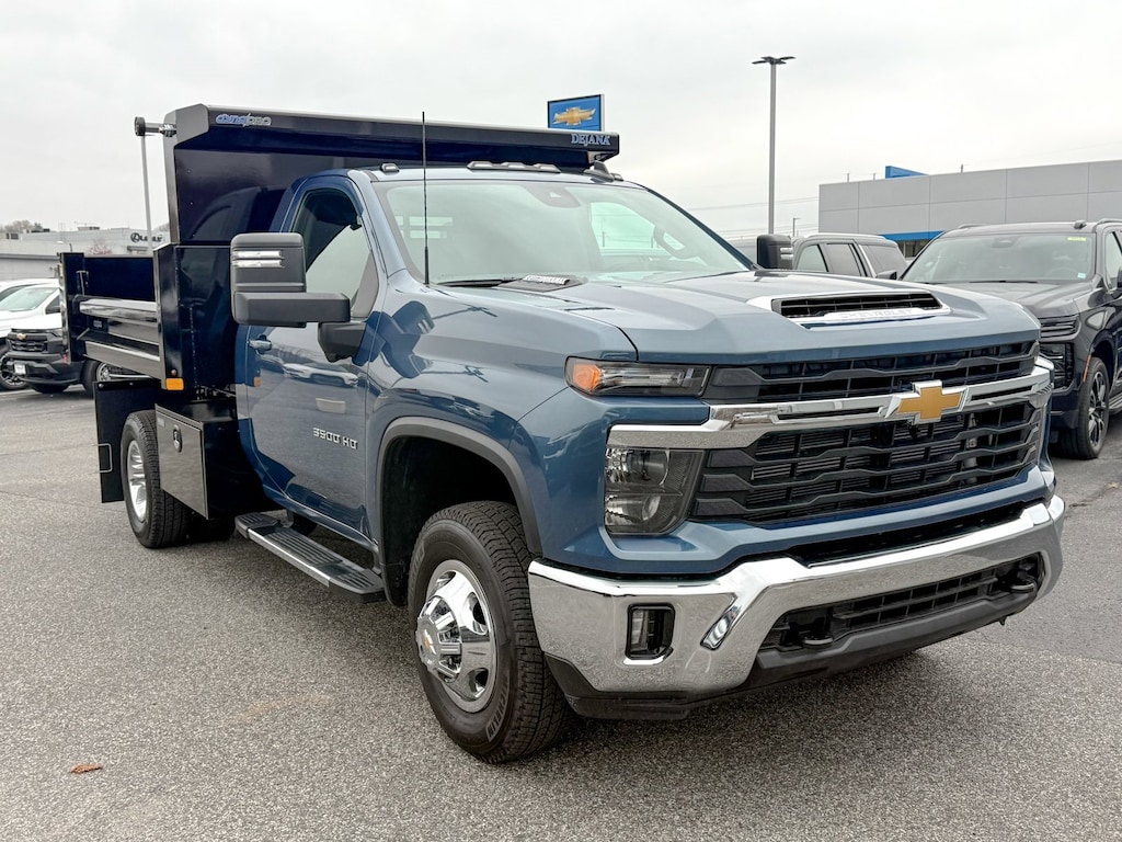 Lakeshore Blue Metallic 2025 Chevrolet Silverado 3500HD LT 4WD 10-Speed Automatic Duramax 6.6L V8 Turbodiesel 10-Way Power Driver Seat Adjuster w/Lumbar, Convenience Package, Dual-Zone Automatic Climate Control, Electric Rear-Window Defogger, Front LED Fog Lamps, Heat Package, Heated Driver & Front Outboard Passenger Seats, Heated Steering Wheel, Manual Tilt-Wheel/Telescoping Steering Column, Remote Start Package, Remote Vehicle Starter System, Unauthorized Entry Theft-Deterrent System, 17 Painted Steel Wheels, 170 Amp Alternator, 2 Speakers, 2-Speaker Audio System Feature, 2-Speed Active Electronic AutoTrac Transfer Case, 2-Speed Electronic Shift Transfer Case, 220 Amp Alternator, 3.42 Rear Axle Ratio, 3.73 Rear Axle Ratio, 4-Way Manual Driver Seat Adjuster, 4-Way Manual Passenger Seat Adjuster, 4-Wheel Disc Brakes, 6 Rectangular Chromed Tubular Assist Steps (LPO), ABS brakes, Air Conditioning, All-Weather Floor Liners (LPO), AM/FM radio: SiriusXM, Auto High-beam Headlights, Black Frame-Mounted Front Recovery Hooks, Black Mirror Caps, Bluetooth® For Phone, Brake assist, Bumpers: chrome, Chrome Front Grille Bar, Cloth Seat Trim, Color-Keyed Carpeting Floor Covering, Compass, Compass Located In Instrument Cluster, Deep-Tinted Glass, Delay-off headlights, Driver door bin, Driver vanity mirror, Dual front impact airbags, Dual front side impact airbags, Dual rear wheels, Electronic Stability Control, Engine Block Heater, Enhanced 12.3 Diagonal Driver Information Center, Exhaust Brake, Front 40/20/40 Split-Bench Seat, Front anti-roll bar, Front Center Armrest w/Storage, Front reading lights, Front Rubberized Vinyl Floor Mats, Front wheel independent suspension, Fully automatic headlights, Heated door mirrors, Heavy-Duty 80 Amp-Hr Battery, Illuminated entry, Keyless Open & Start, Low tire pressure warning, Manual Tilt Inside Rearview Mirror, Occupant sensing airbag, OnStar Services Capable, Outside temperature display, Overhead airbag, Overhead console, Panic alarm, Passenger door bin, Passenger vanity mirror, Power door mirrors, Power steering, Power Take-Off, Power windows, Preferred Equipment Group 1LT, Radio: Chevrolet Infotainment 3 Premium System, Remote keyless entry, SiriusXM Trial Subscription, Snow Plow Prep Package, Speed control, Steering Wheel Audio Controls, Steering wheel mounted audio controls, Steering Wheel Mounted Electronic Cruise Control, Suspension Package, Tachometer, Tilt steering wheel, Traction control, Trip computer, Turn signal indicator mirrors, Upfitter Switch Kit (5), Variably intermittent wipers, Voltmeter, Winter Grille Cover, Wrapped Steering Wheel, Chassis Cab, 10-Way Power Driver Seat Adjuster w/Lumbar, Convenience Package, Dual-Zone Automatic Climate Control, Electric Rear-Window Defogger, Front LED Fog Lamps, Heat Package, Heated Driver & Front Outboard Passenger Seats, Heated Steering Wheel, Manual Tilt-Wheel/Telescoping Steering Column, Remote Start Package, Remote Vehicle Starter System, Unauthorized Entry Theft-Deterrent System.