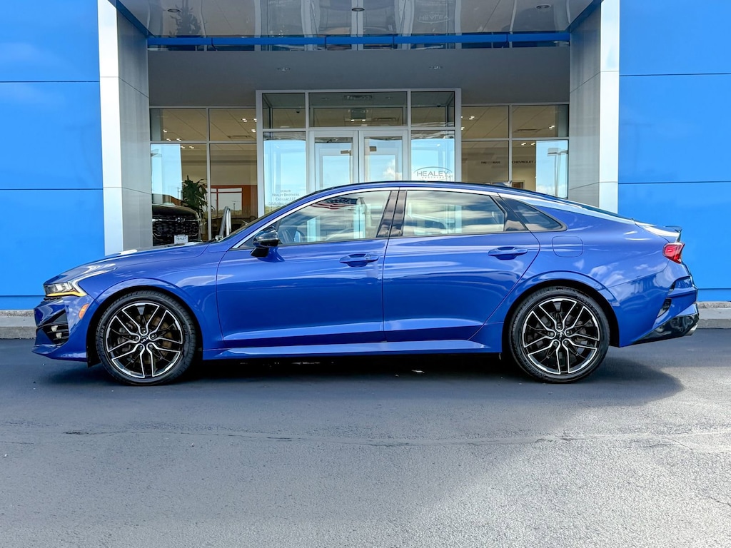 Sapphire Blue 2023 Kia K5 GT FWD 8 Speed Dual Clutch 2.5L I4 DGI Turbocharged DOHC 16V LEV3-ULEV70 290hp 4-Wheel Disc Brakes, 6 Speakers, ABS brakes, Active Sound Design, Air Conditioning, Alloy wheels, AM/FM radio: SiriusXM, Apple CarPlay & Android Auto, Auto High-beam Headlights, Auto Up/Down Rear Windows, Automatic temperature control, Bose Premium Audio, Brake assist, Bumpers: body-color, Cargo Net, Cargo Tray, Carpeted Floor Mats, Delay-off headlights, Driver door bin, Driver vanity mirror, Dual front impact airbags, Dual front side impact airbags, EC Mirror w/Homelink, Electronic Stability Control, Emergency communication system, Forward Collision Avoidance-Assist, Four wheel independent suspension, Front anti-roll bar, Front Bucket Seats, Front Center Armrest, Front dual zone A/C, Front fog lights, Front reading lights, Fully automatic headlights, GT Brown Color Package, GT1 Package, Heated door mirrors, Heated front seats, Heated Sport Bucket Seats, Heated Steering Wheel, Highway Driving Assist, Illuminated entry, Knee airbag, Leather-Wrapped Shift Knob, LED Projection Headlamps, Low tire pressure warning, Memory Driver's Seat & Outside Mirrors, Navigation System, Navigation-Based Smart Cruise Control - Curve, Occupant sensing airbag, Outside temperature display, Overhead airbag, Overhead console, Panic alarm, Parking Collision Avoidance-Assist - Reverse, Parking Distance Warning - Forward & Reverse, Passenger door bin, Passenger vanity mirror, Power Child Lock, Power door mirrors, Power driver seat, Power Folding Outside Mirrors w/LED Turn Signals, Power Front Passenger Seat, Power moonroof, Power steering, Power windows, Radio data system, Radio: AM/FM/MP3 Audio System, Rear anti-roll bar, Rear reading lights, Rear seat center armrest, Rear side impact airbag, Rear window defroster, Remote keyless entry, Safe Exit Assist w/Lock, Security system, Smart Cruise Control w/Stop & Go, Smart Key w/ Push Button and Remote Start, Speed control, Speed-sensing steering, Split folding rear seat, Spoiler, Sport steering wheel, Steering wheel mounted audio controls, Surround View Monitor, SynTex Seat Trim, Tachometer, Telescoping steering wheel, Tilt steering wheel, Traction control, Trip computer, Trunk Cargo Management System, Turn signal indicator mirrors, Variably intermittent wipers, Ventilated Front Seats, Wheel Locks, Wheels: 19 Gloss Black Machined Finish Alloy.
